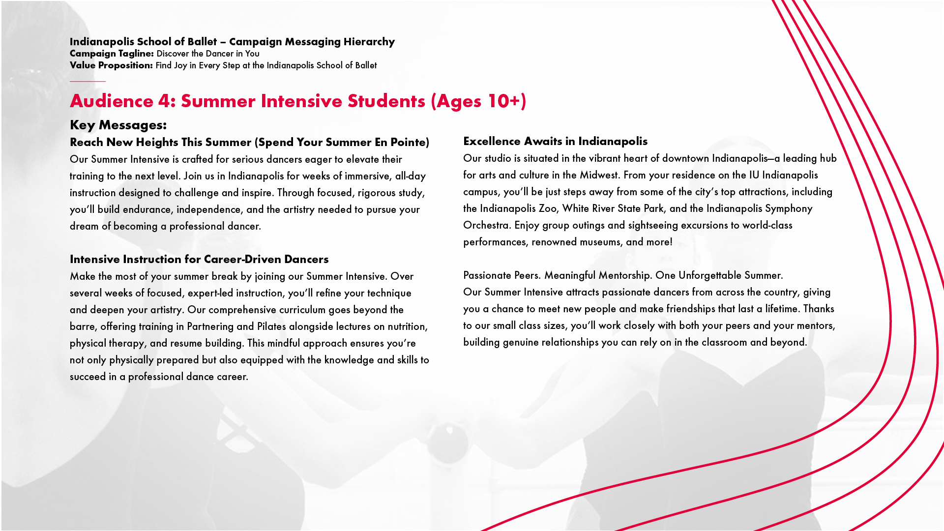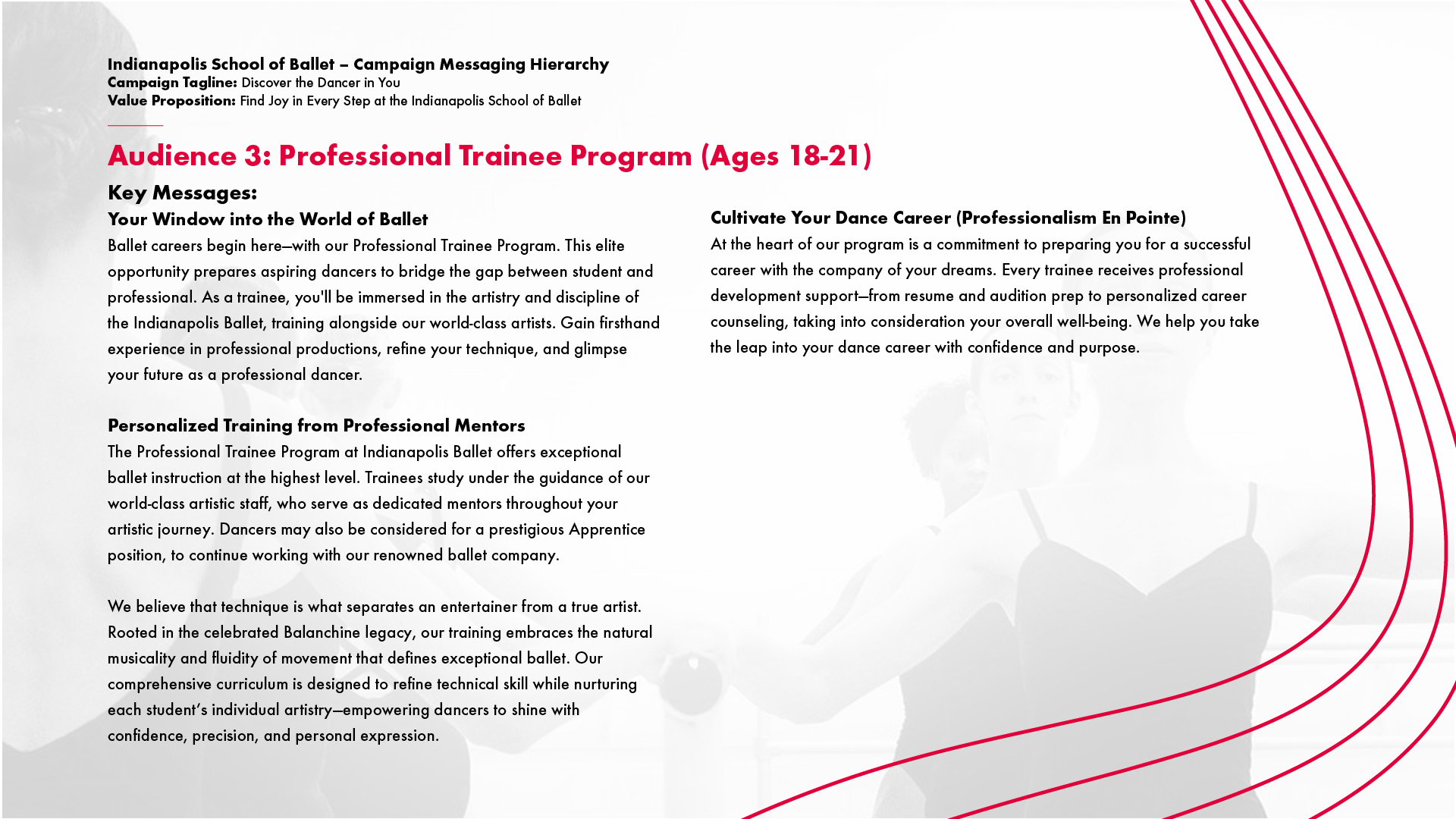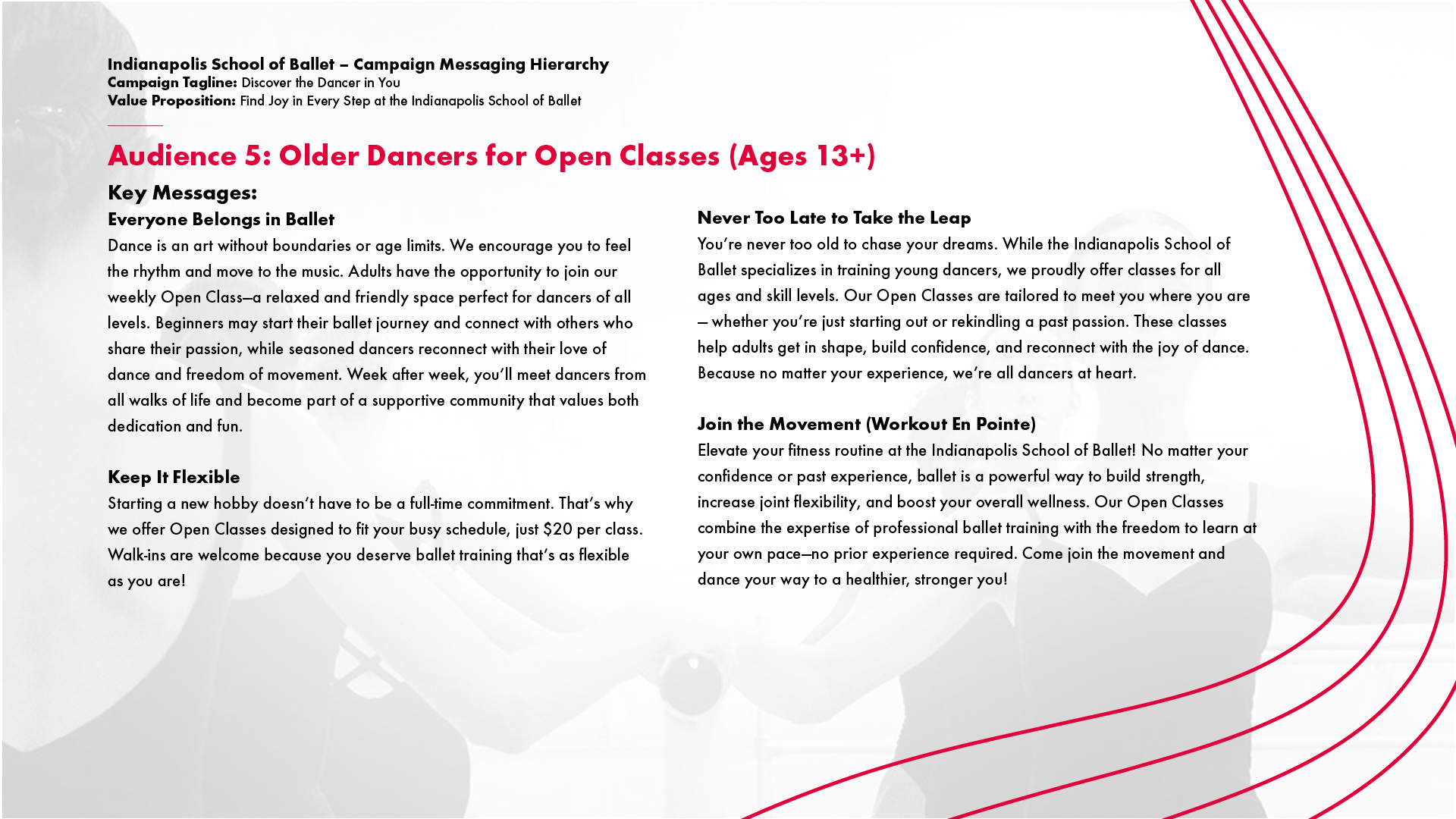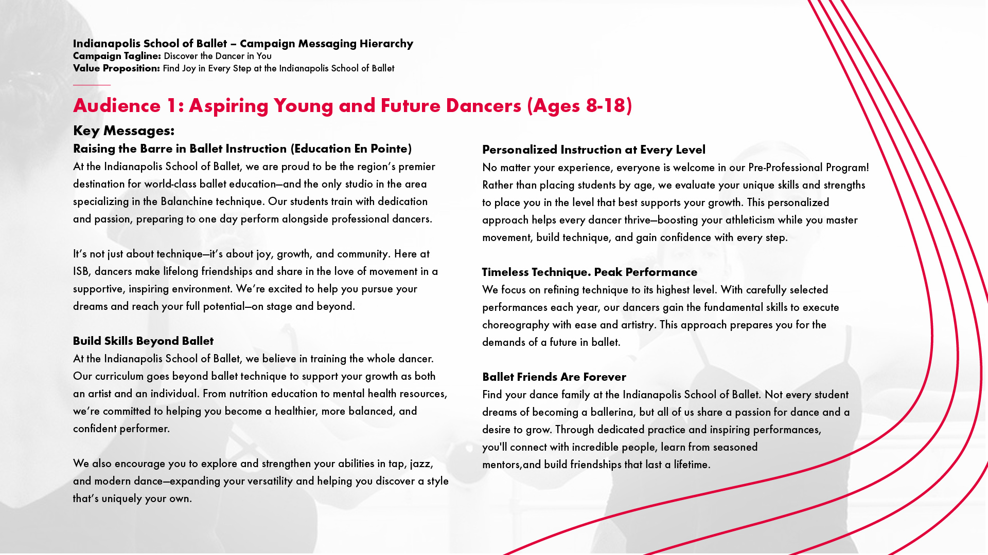 After evaluating all three directions, we selected Discover the Dancer in You as the campaign theme. This tagline struck the perfect balance of welcoming newcomers while honoring the transformative journey that ballet offers at every level. We paired it with a value proposition that captured the heart of the experience: Find Joy in Every Step at the Indianapolis School of Ballet.